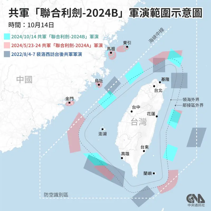 (中央社台北17日綜合外電報導)共軍14日於台灣周邊展開「聯合利劍-2024B演習」。英國媒體今天引述台灣國安高層披露,當天中方36艘艦艇有25艘抵近24浬鄰接區,共軍另有朝內陸方向發射2枚飛彈。
