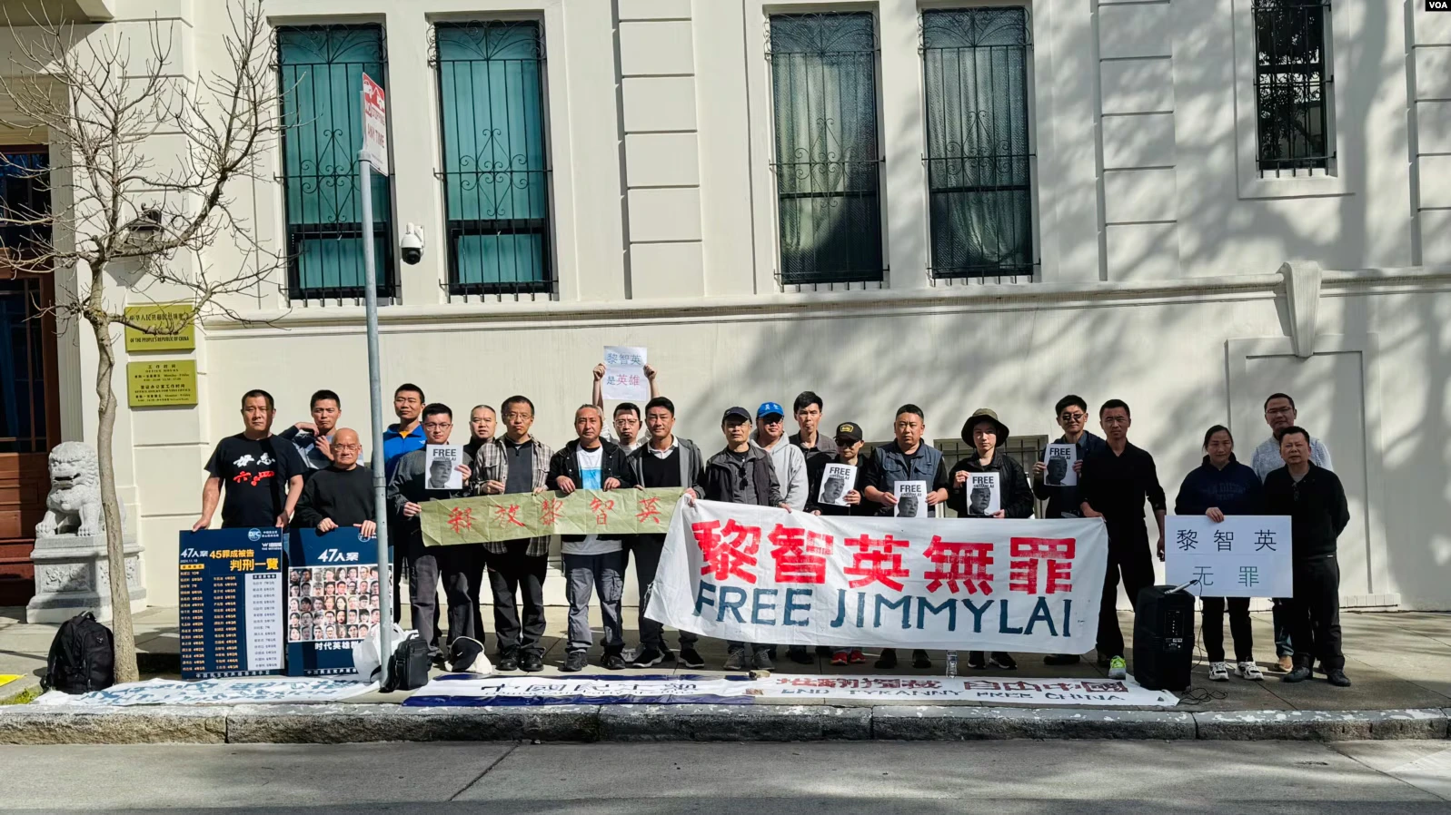 舊金山 — 星期六(2月22日)當地時間下午,中國民主黨、中國民主教育基金會、人道中國、亞洲女性難民藝術組等民主團體下午在中國駐舊金山總領事館前抗議中國政府迫害香港民主派人士、傳媒大亨黎智英黎智英,要求當局釋放黎智英。