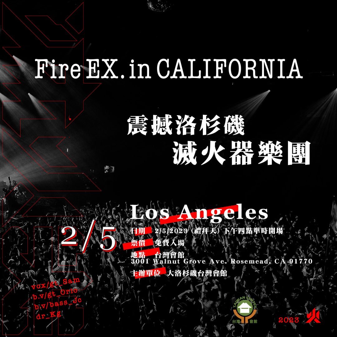 2月5日下午4點滅火器樂團在將在大洛杉磯台灣會館舉辦演唱會﹐免費入場﹐讓鄉親們親身體驗他們充滿魅力的現場演出。