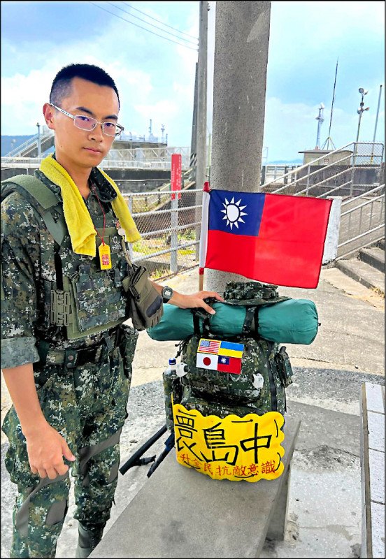 (中央社基隆25日綜合外電報導)22歲的退伍士兵蔡宗霖身穿迷彩服、手持塑膠步槍,在台灣徒步環島已經一個多月。在兩岸關係緊張之際,他希望藉著自己行動,喚起民眾對中共威脅的關注,提高全民抗敵的意識。
