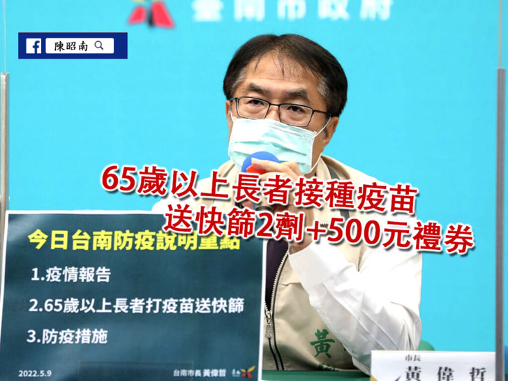 對此,台南市政府為提高長輩接種率,祭出殺手鐧,市長黃偉哲昨(9)日公布,台南市65歲以上長者接種疫苗,就送快篩2劑,外加500元禮券,今(10)日一早果然吸引不少長輩前來接種。