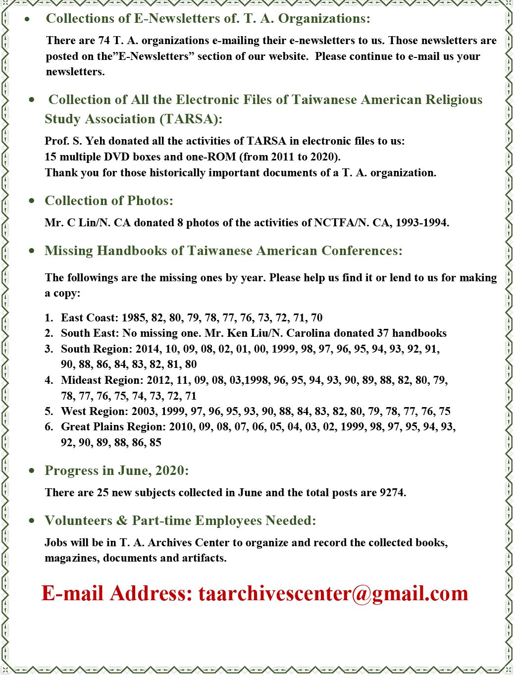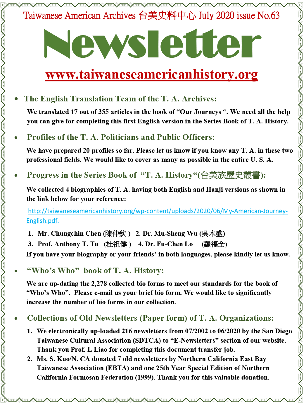 台美人台加人台美史料中心T. A. Archives 七月 Newsletter of /2020 June 30, 2020 敬請支持‧歡迎訂閱本報newsletter 本報24/7隨時更新 歡迎定閱newsletter